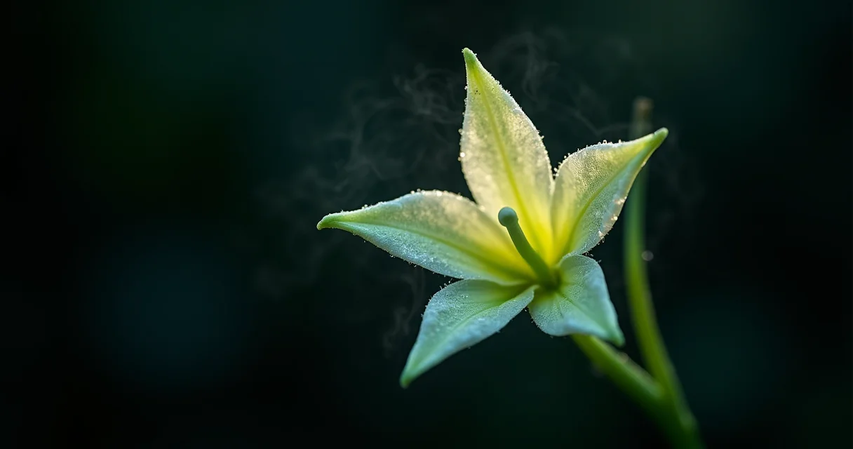 As flores tubulares da dama-da-noite parecem pequenas estrelas verdes que só se abrem ao anoitecer. O contraste com a folhagem escura cria um efeito dramático sob a luz da lua.