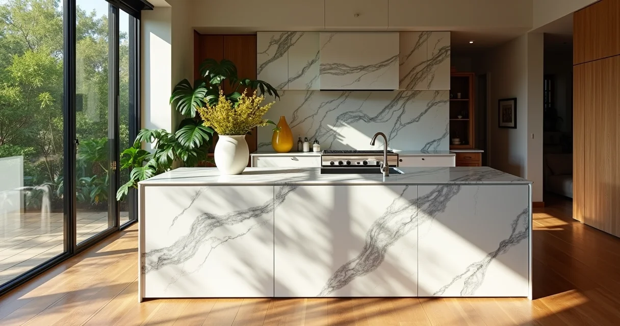 É uma alternativa de baixa manutenção, mais resistente a manchas e com menor absorção de água que o mármore natural. A instalação também costuma ser mais simples.